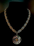 The “center boss” on this shield pendant is a tigers eye, which compliments the stainless steel and bronze rings used to construct this unique chainmail necklace! Chain measures 19 inches.