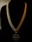 Unique bronze on one side and stainless steel on the other chainmail Persian weave necklace featuring a large Celtic knot pendant. Chain measures 26 inches.