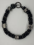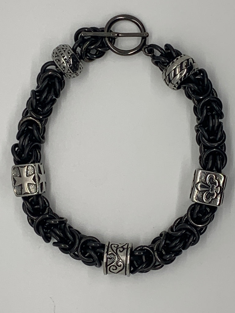 Blackened stainless steel Byzantine weave bracelet accented with an eclectic mix of steel beads. Chain measures