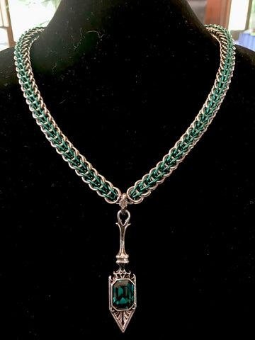 Unique chainmail necklace featuring a full Persian weave chain using stainless steel and anodized aluminum rings and accented with a crystal imbued pewter absinthe spoon pendant! Chain measures 22.5 inches.