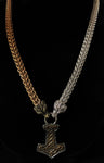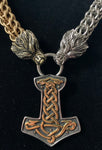 Half brass and half stainless steel chainmail necklace capped with wolf heads holding a nice two color Mjolnir pendant. Chain measures 26 inches.