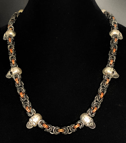 Blackened stainless steel Byzantine weave chain accented with copper rings and steel skull beads! Chain measures 23 inches.