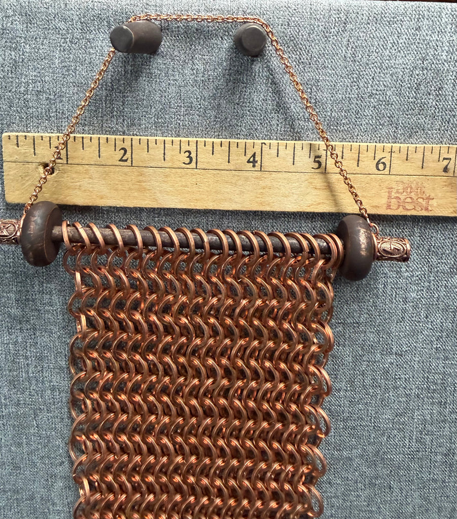 Copper flat ring chainmail wall hanging shaped in a swallowtail banner shape.