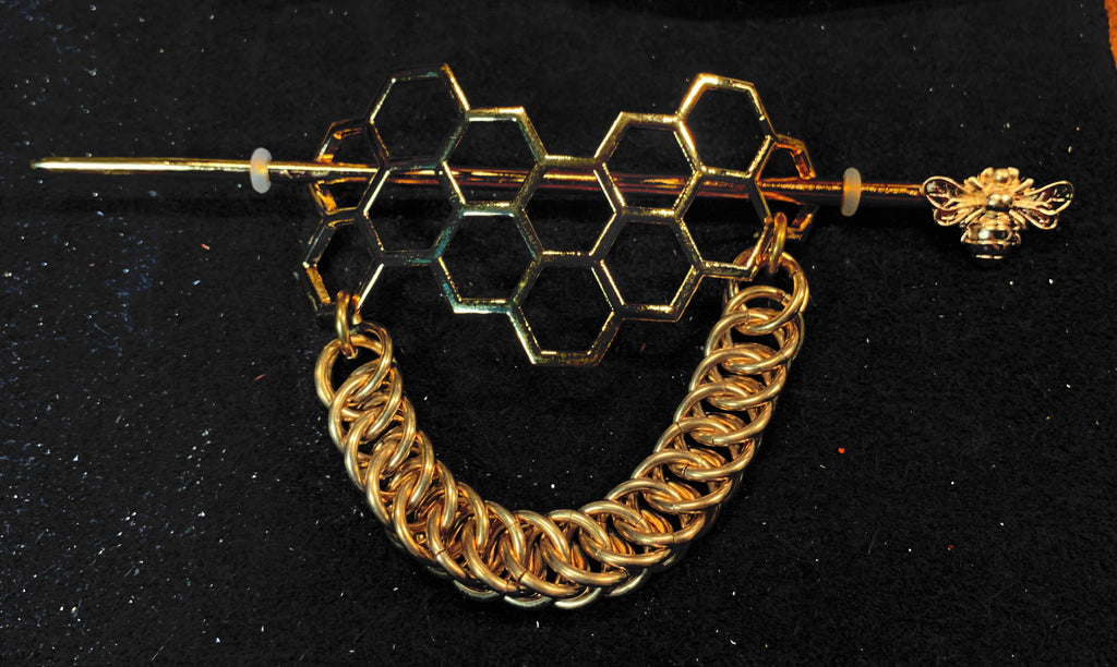 Nickel free alloy hairpin with a matching brass chainmail loop. Pin has a honeycomb motif with a bee pin.