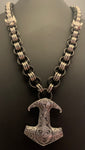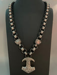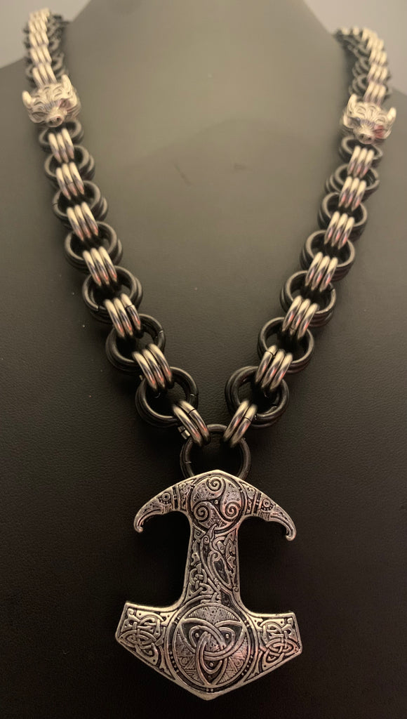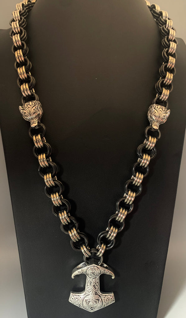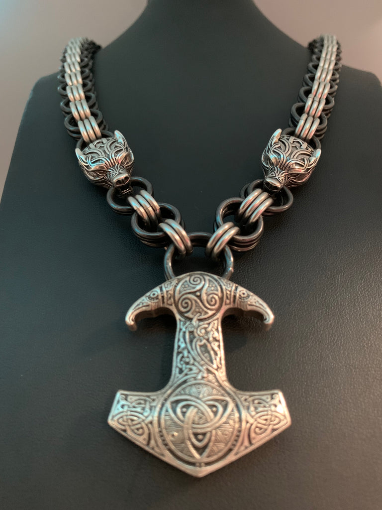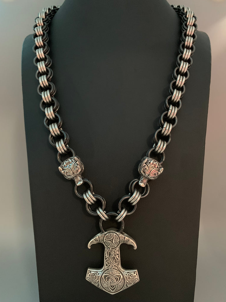 14 gauge stainless steel and blackened stainless steel rings were used for this meaty chain featuring a nicely glyphed Mjolnir accented with wolf head chain caps. Continuous chain measures 26 inches.