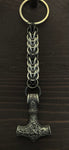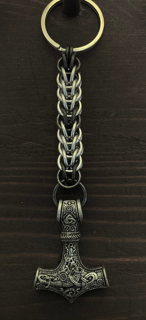 Stainless steel and blackened stainless steel chainmail keychain featuring a matching Mjolnir pendant.