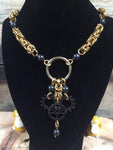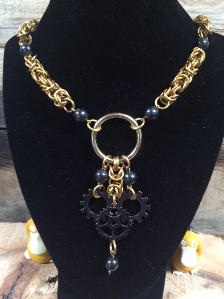 Get your steam on with this eclectic gear necklace. Made with gold aluminum rings and black beads.